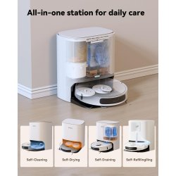 La stazione di base 5 in 1 del Imou RV3 non solo si occupa dell'autosvuotamento del serbatoio, ma gestisce anche il self-lavaggio, l'autoasciugatura e il riempimento automatico. Inoltre, il sistema di lavaggio del mocio utilizza acqua calda a 55°C per rimuovere macchie e odori ostinati, mantenendo il robot sempre pronto all'uso con panni perfettamente puliti.