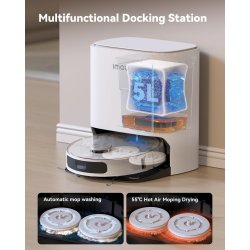 Il design innovativo include un serbatoio d'acqua 2 in 1, che unisce il serbatoio per l'acqua pulita e quello per l'acqua sporca, con una capacità totale di 5 litri. I due panni rotanti del robot, che operano a 180 giri al minuto, sono estremamente efficaci nel rimuovere anche le macchie più difficili. Al termine del ciclo di pulizia, la stazione di base pulisce e asciuga automaticamente i panni, preparando il robot per la sessione successiva.