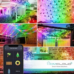 Corda in PVC con luci decorative Smart a LED RGB-IC per esterni. Tecnologia Wi-Fi + Bluetooth, controllabile tramite Smartphone e Telecomando RF a 24 tasti. Dimmerabile per creare atmosfere personalizzate. Resistente all'acqua (IP65), ideale per decorazioni outdoor in ogni stagione.